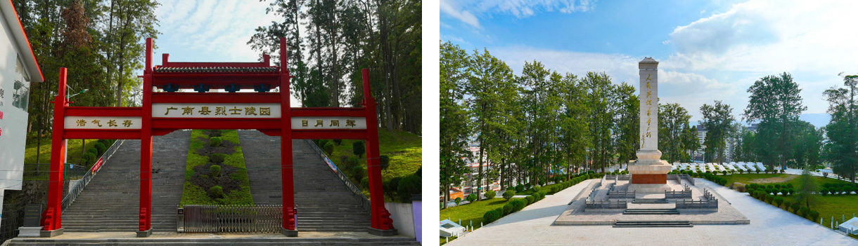 广南县烈士陵园始建于1954年4月,1974年1月迁建于现址,位于云南省广南县城铜鼓广场旁绿秀坡,面积14124平方米。自广南县退役军人事务局成立以来,多次对烈士陵园进行提质改造,设施齐全、环境优美、庄严肃穆。陵园内有烈士墓区、纪念碑、纪念广场、烈士纪念馆及相关配套设施。纪念广场14124平方米,矗立革命烈士纪念塔,题刻毛泽东主席的书法字体“人民英雄永垂不朽”,塔座铭刻序言、烈士名录、纪念浮雕。