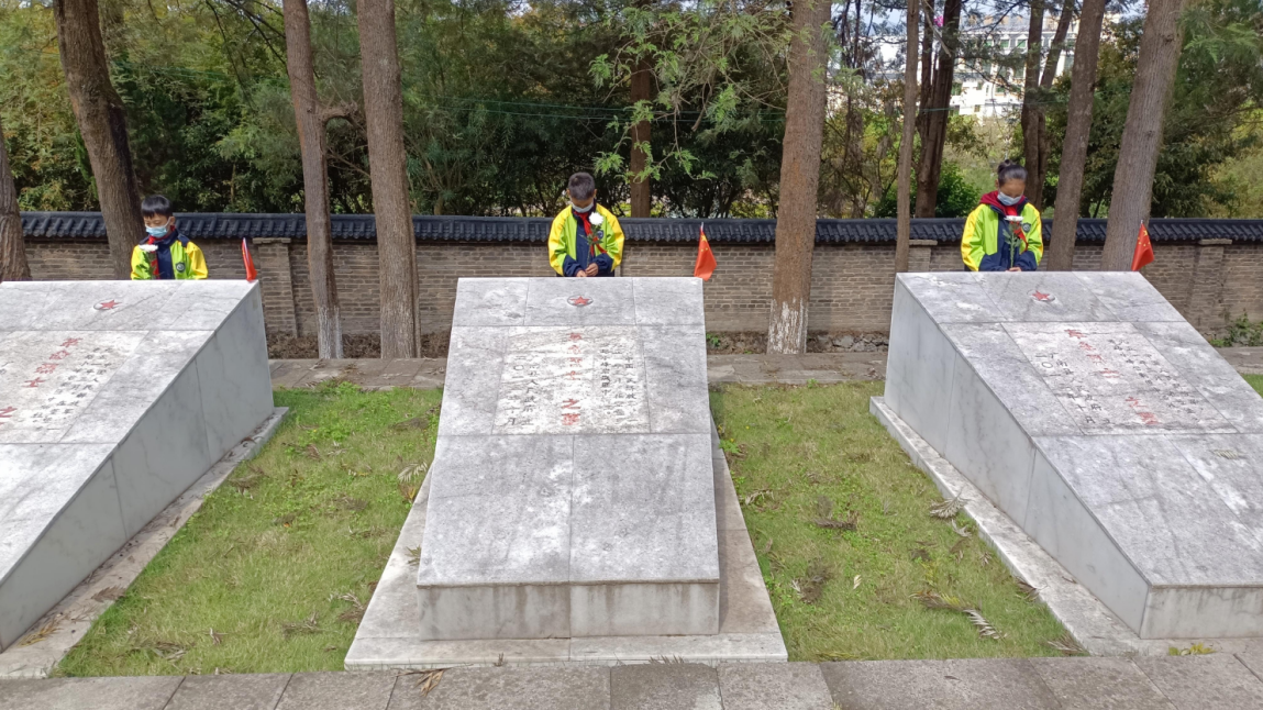 (县城区三小少先队员为“烈士亲人”擦拭墓碑清理杂草)